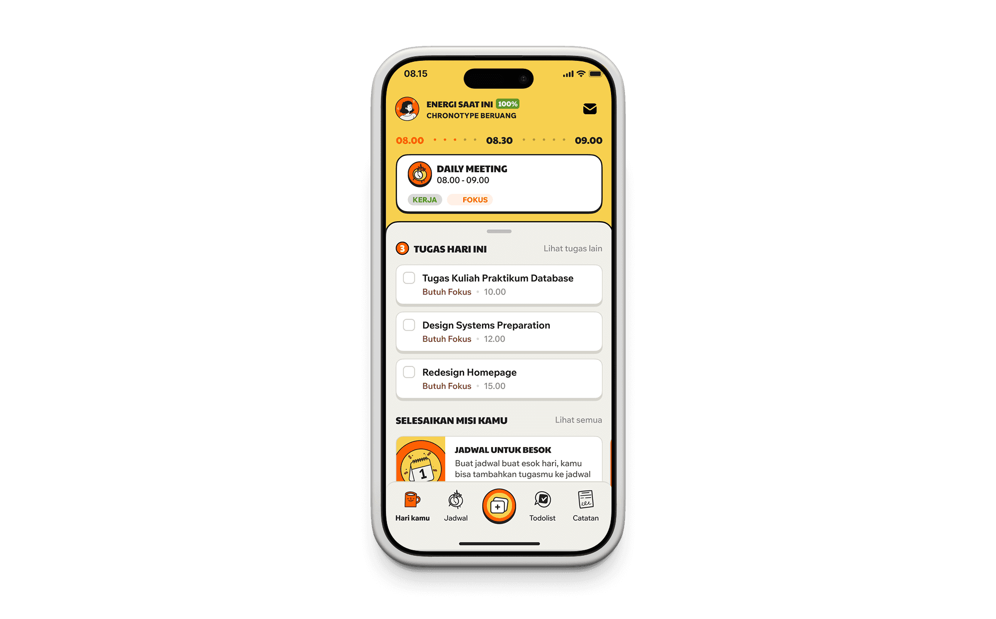 A productivity app that combines of chronotype and a to-do lists app, the app works to find user best productivity time and where they can decide which time for the best for higher activity.